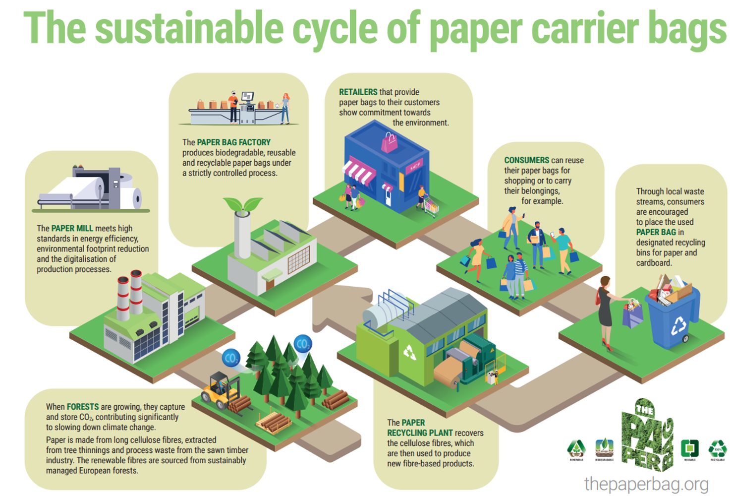 Stockholm/Paris, 20 February 2024. Less raw material, less waste, fewer emissions – the circular economy is at the top of the agenda. Choosing fibre-based packaging such as paper carrier bags is one piece of the puzzle that retailers and brand owners can complete to take the next step in contributing to the bio-based circular economy. Paper carrier bags are a welcome resource in the paper recycling mix. A member of the initiative “The Paper Bag” explains how paper carrier bags are recycled into new fibre-based products. An infographic shows the cycle of paper carrier bags.